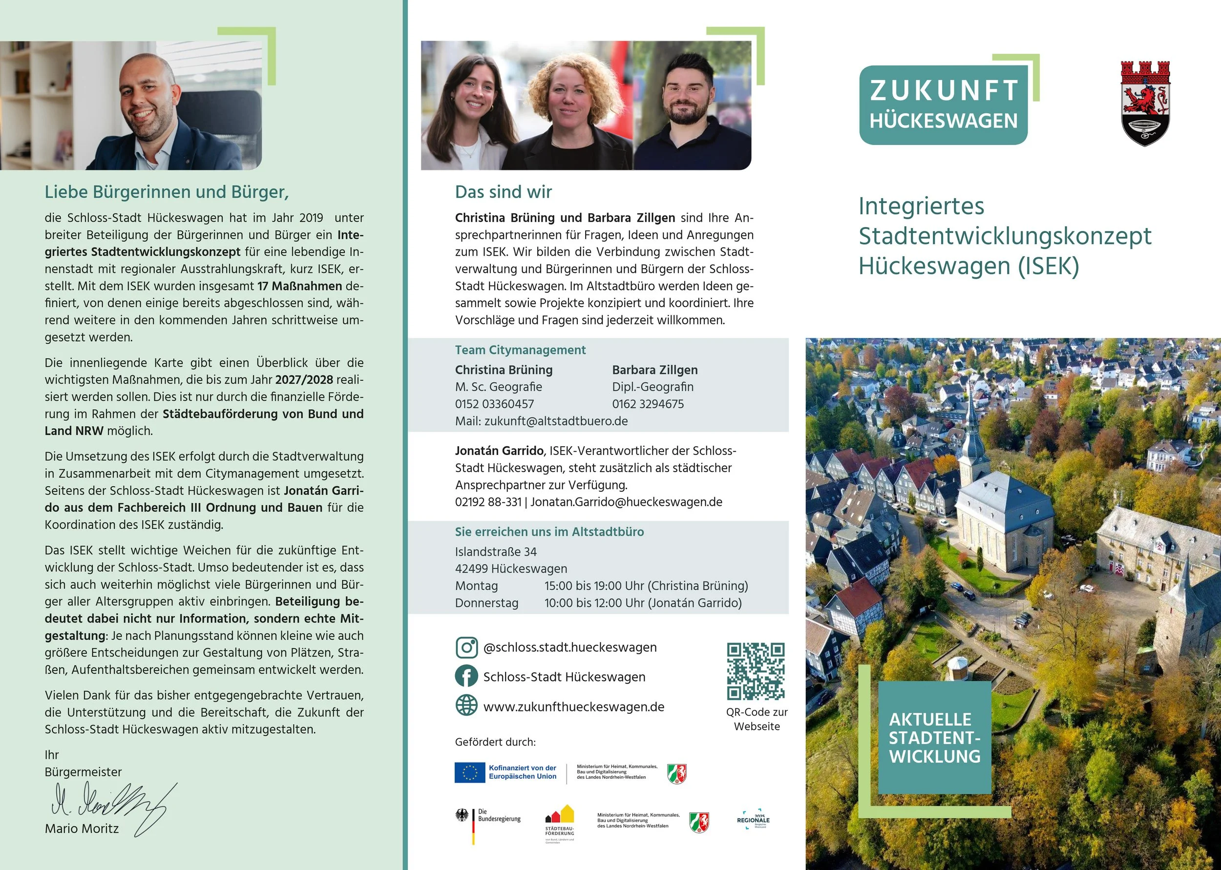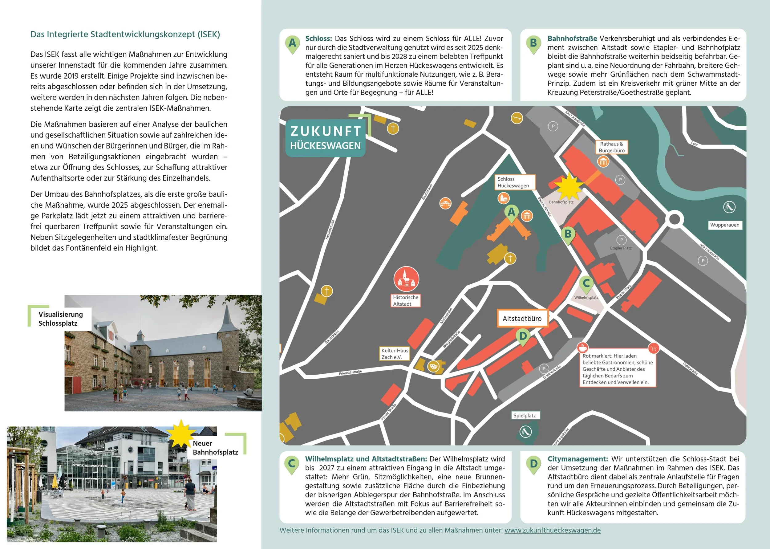 die Schloss-Stadt Hückeswagen hat im Jahr 2019 unter breiter Beteiligung der Bürgerinnen und Bürger ein Integriertes Stadtentwicklungskonzept für eine lebendige Innenstadt mit regionaler Ausstrahlungskraft, kurz ISEK, erstellt. Mit dem ISEK wurden insgesamt 17 Maßnahmen definiert, von denen einige bereits abgeschlossen sind, während weitere in den kommenden Jahren schrittweise umgesetzt werden.